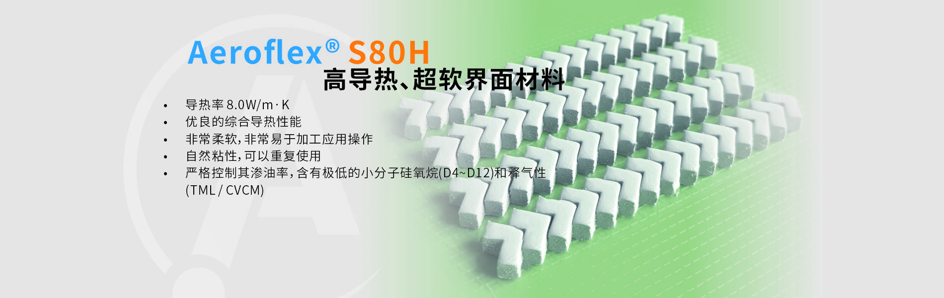 Aeroflex S80 is a 8 W/m∙K soft gap filler interface material with great thermal performance and high compliance. Its soft interface pad conforms well to minimal pressure, resulting in little or no stress on mating parts. It has extremely low silicone extractable ability compared to many other silicone interface products and also meets NASA outgassing specification. FlexteinTM S80H is super-flexible, hi-performance design-in material. It is electrically insulating, stable from -60ºC to 200ºC an