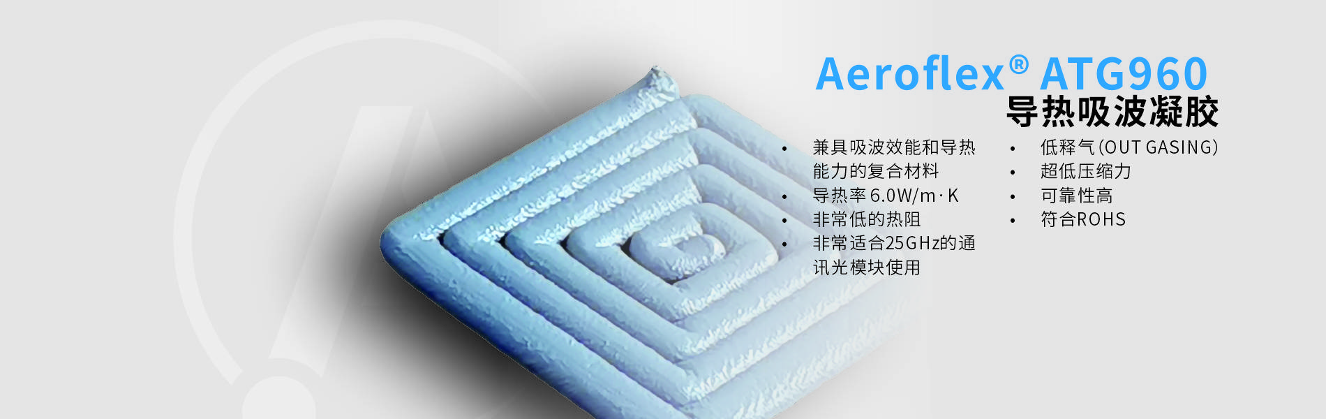 Aeroflex ATG960 is special designed for use in high performance devices requiring maximum thermal performance, excellent microwave absorption, low compression force and component reliability. In addition to providing application flexibility and variable gap adaptation, ATG960 will exert minimum stress on your component while maintaining interface contact to maximize thermal transfer. It requires no cure cycle and it’s cross-linked gel structure provides superior long term properties stability an