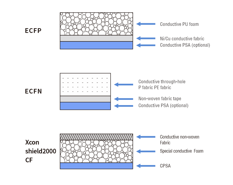 | ECFM | Conductive Foam with Mesh Fabric | - | - | - | - | - | Grey | - | Grey | - | Grey | Grey/composite | Grey/composite | Grey/composite | Thickness 0.2 to 1.5mm, shape customizable (minimum order of 500 M2 or equivalent size for customized shape) | |