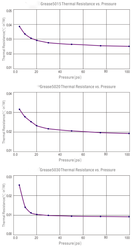 | 热阻@50psi | °C·in²/W | ASTM D5470 | 0.027 | 0.023 | 0.009 | 0.01 | 0.007 |